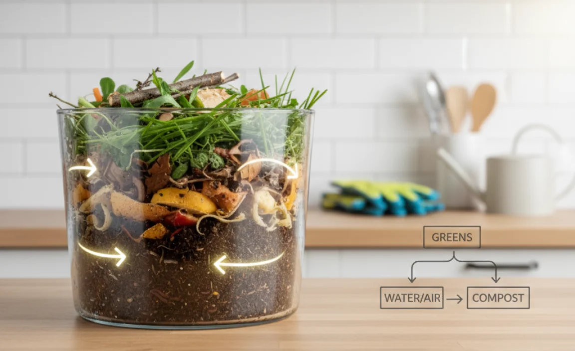 For best results, aim for a balance of about 2-3 parts brown (carbon-rich) materials to 1 part green (nitrogen-rich) materials by volume. This ensures good aeration and nitrogen for the microbes.