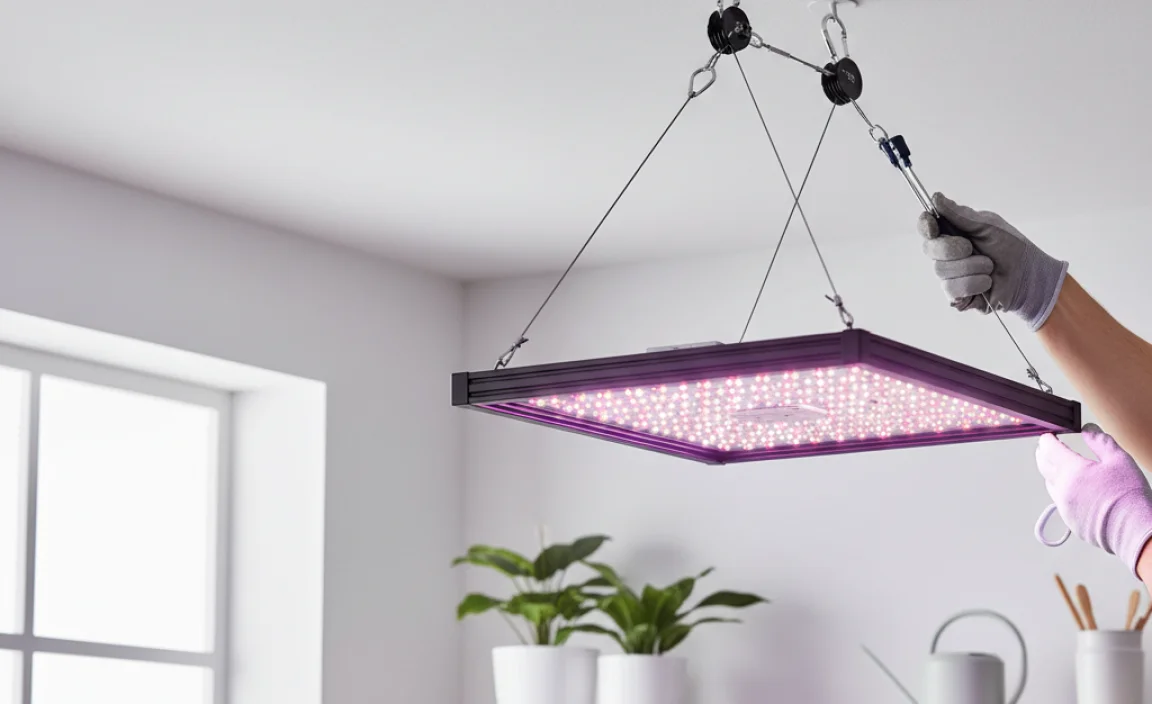 In conclusion, hanging a grow light from the ceiling is simple. First, choose the right spot for light and plants. Use sturdy hooks or chains to secure the light. Adjust the height as your plants grow. Now you can help your plants thrive! For more tips, read about plant care or lighting options. Let’s keep our plants healthy and happy!