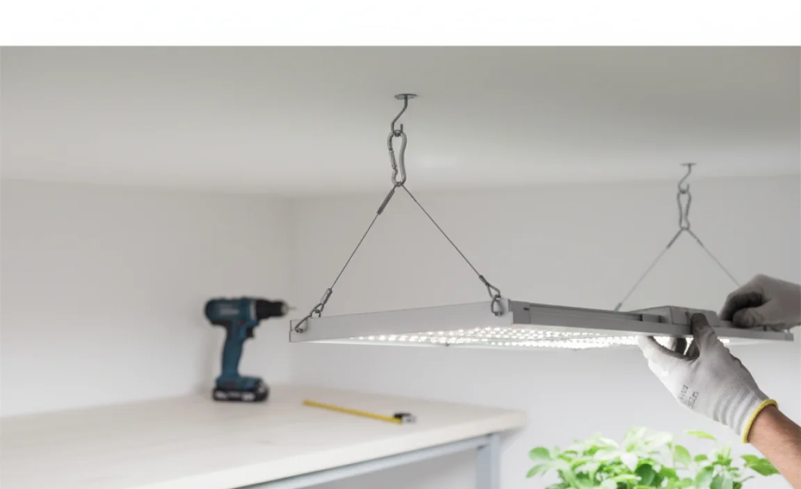 Start by checking your ceiling. Look for beams or other strong areas to hang your light. These spots are essential for support. Next, mark where you’ll drill. Drill holes carefully and use anchors to hold the light firmly. This will help keep everything stable. If done right, your plants will thrive under the bright light!