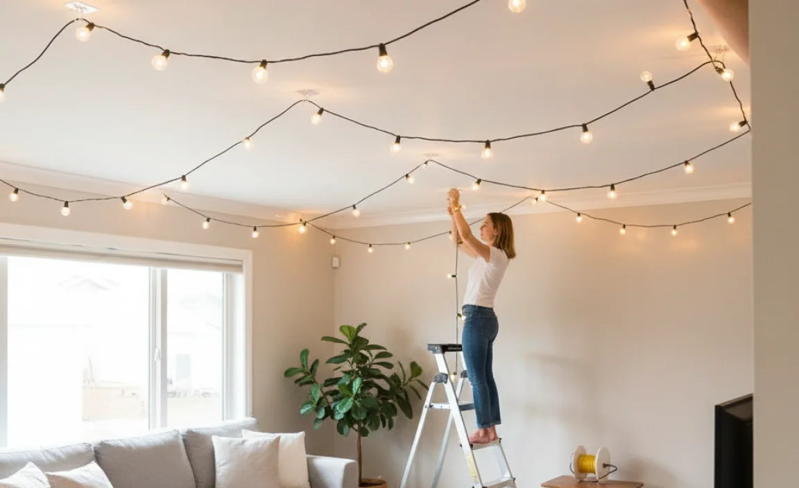 In conclusion, hanging string lights from the ceiling without nails is easy and fun! You can use adhesive hooks, clips, or removable tape. These methods protect your walls and are perfect for renters. Try these tips out in your own space to create a cozy atmosphere. For more ideas and inspiration, read about different lighting styles you can try!