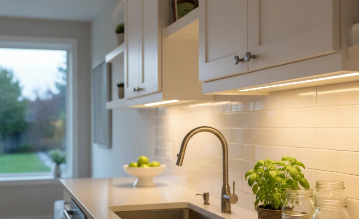 To make it look nice, keep the lights straight and evenly spaced. You can also hide any wires so they don’t show. Finally, test the lights to make sure they work well.”}},{“@type”: “Question”,”name”: “What Are The Best Practices For Choosing The Right Color Temperature For Under Counter Lighting To Complement Kitchen Decor? “,”acceptedAnswer”: {“@type”: “Answer”,”text”: “To choose the right color for under counter lighting in your kitchen, think about the mood you want. Warm colors, like soft white, make the place feel cozy. Cool colors, like bright white, feel fresh and clean. Look at your kitchen colors and pick a light that matches. You can also test a few options to see which you like best!”}}]}